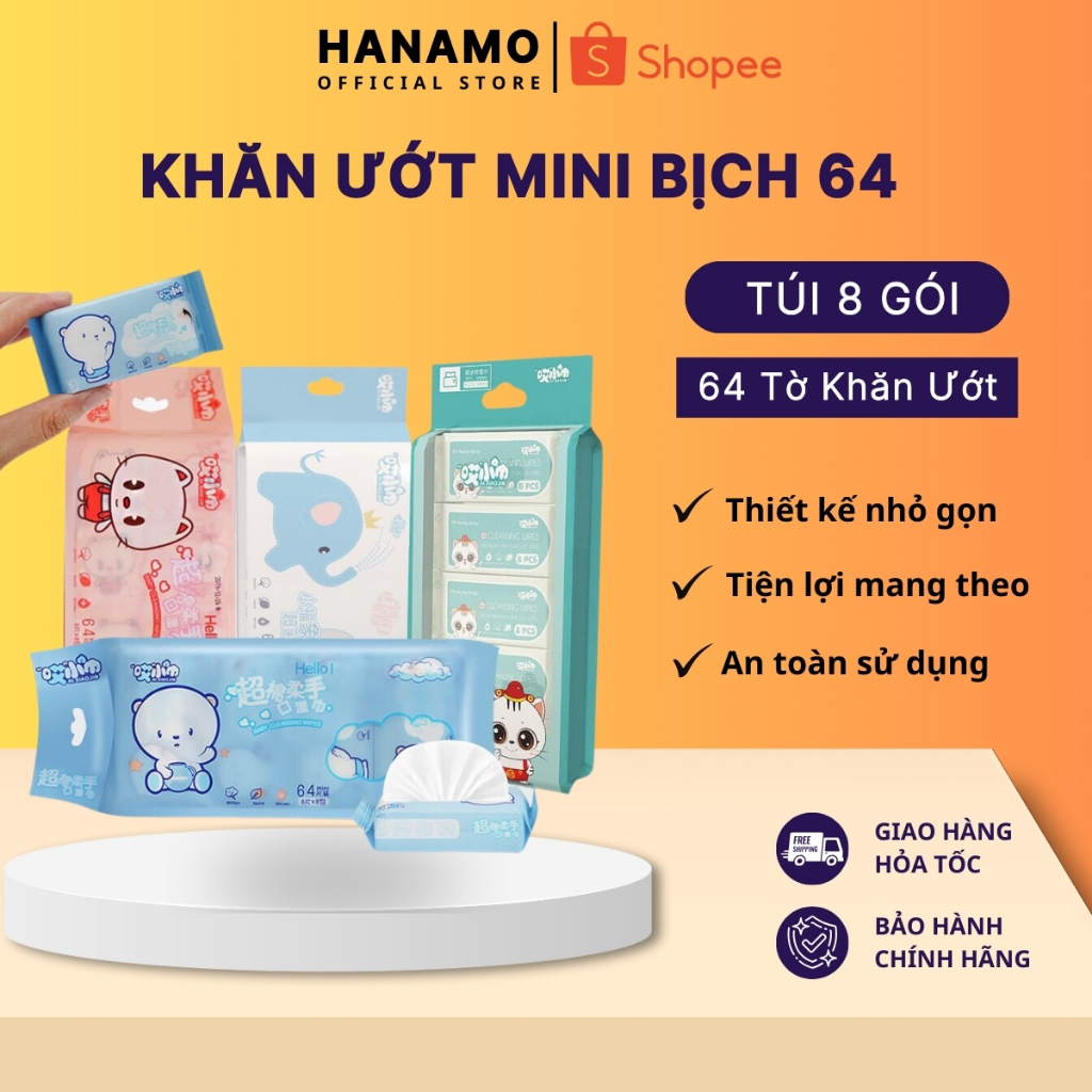 Bịch 64 Khăn Giấy Ướt Mini Bỏ Túi HANAMO Khăn Ướt Đa Năng Du Lịch Dùng Được Cho Trẻ Em