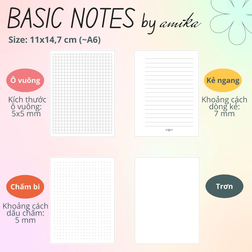 60 tờ Giấy 104 gsm Refill Sổ còng 11x14,7 cm (~A6) - chấm bi / kẻ ngang / ô vuông / trơn