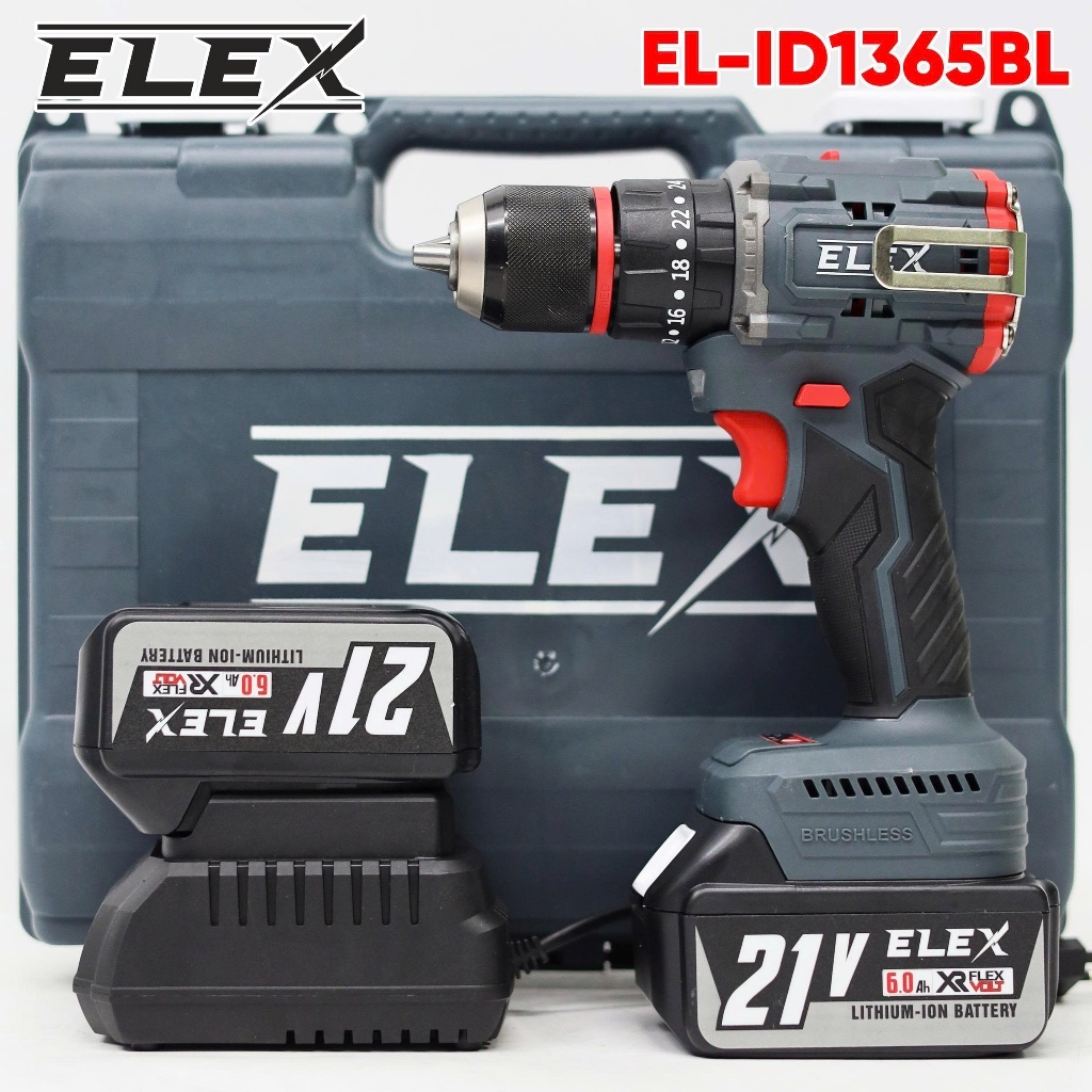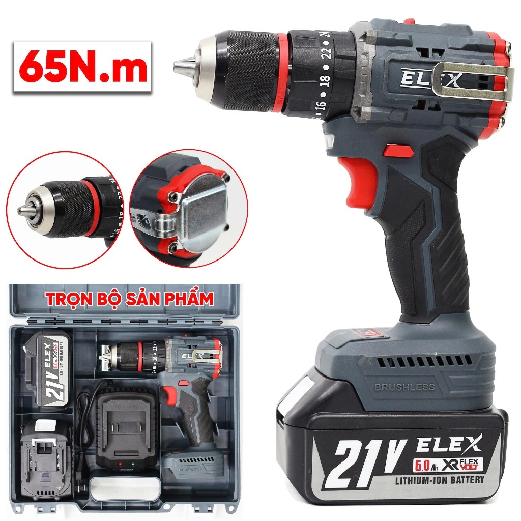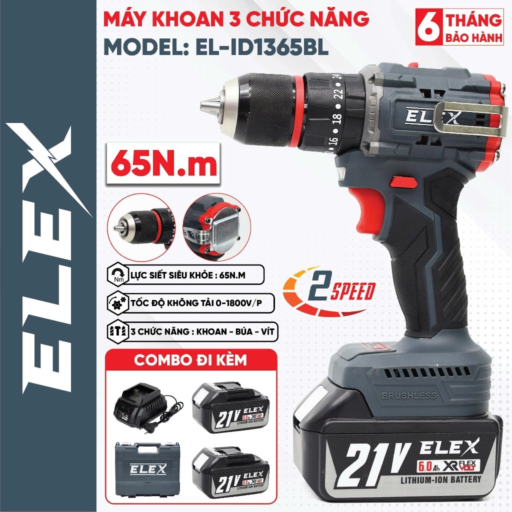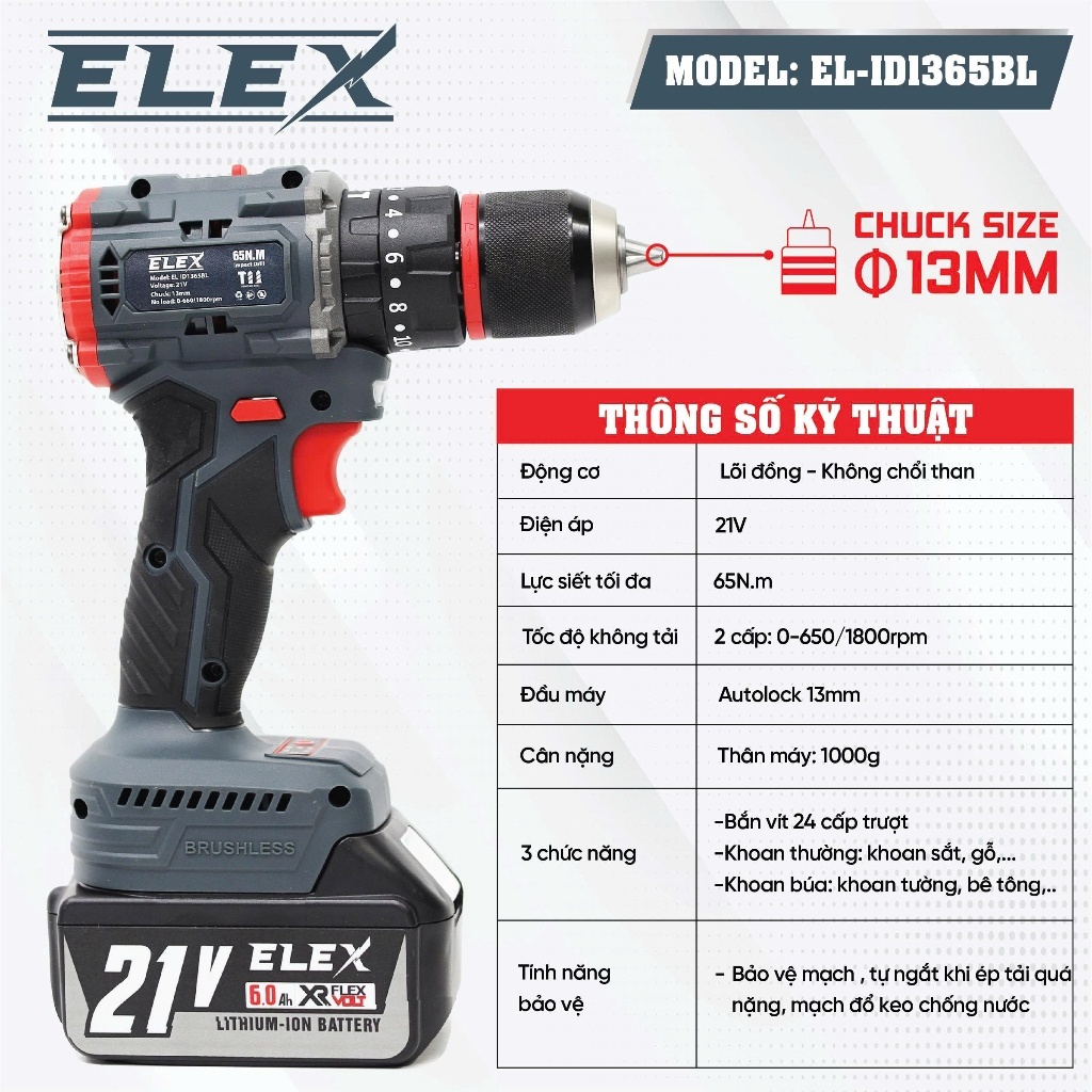 Máy Khoan Pin ELex 13mm EL-ID1365BL Động Cơ Không Chổi Than 3 Chức Năng, Có Búa, Lõi Đồng, Chuyên khoan tường, sắt, gỗ