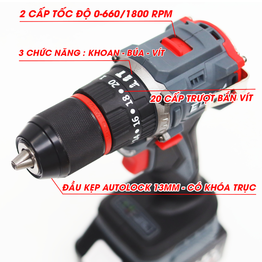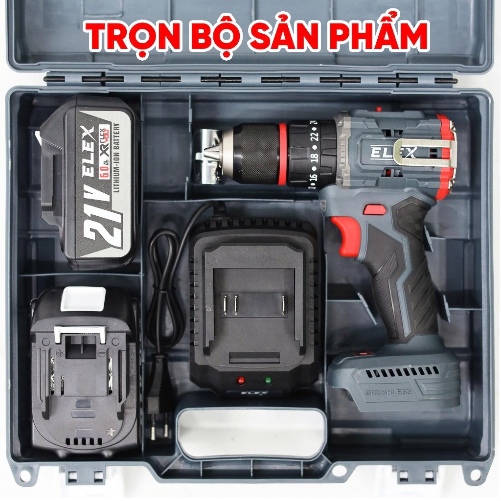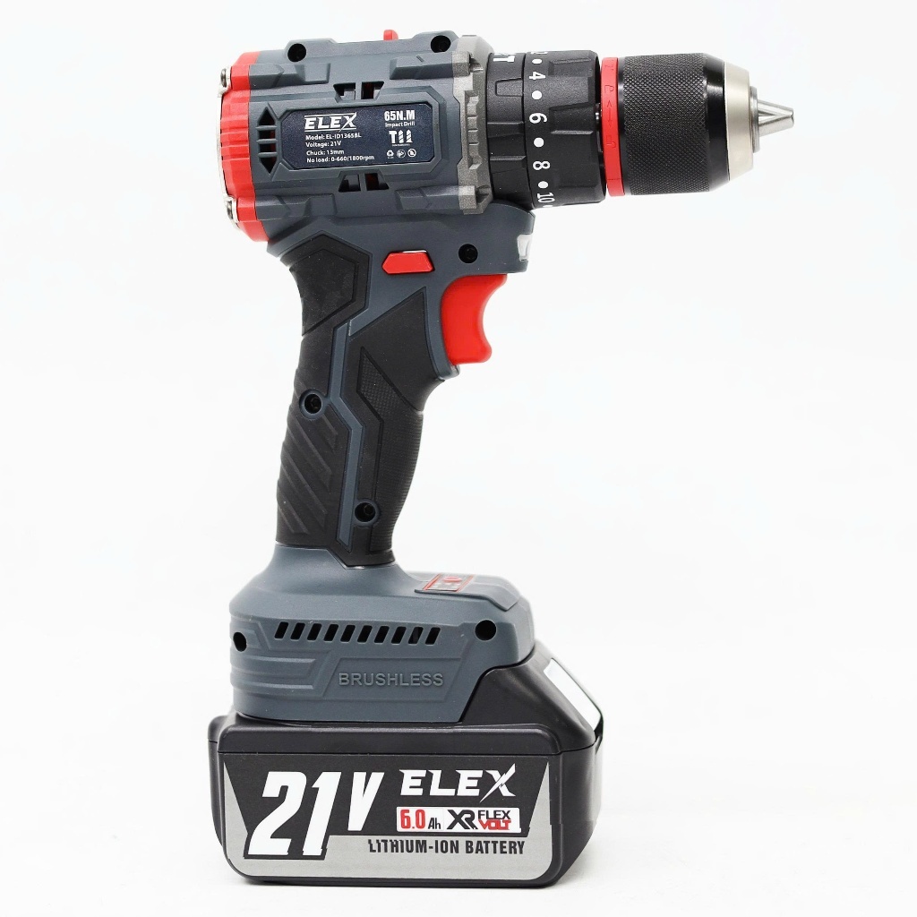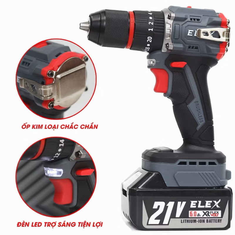 Máy Khoan Pin ELex 13mm EL-ID1365BL Động Cơ Không Chổi Than 3 Chức Năng, Có Búa, Lõi Đồng, Chuyên khoan tường, sắt, gỗ