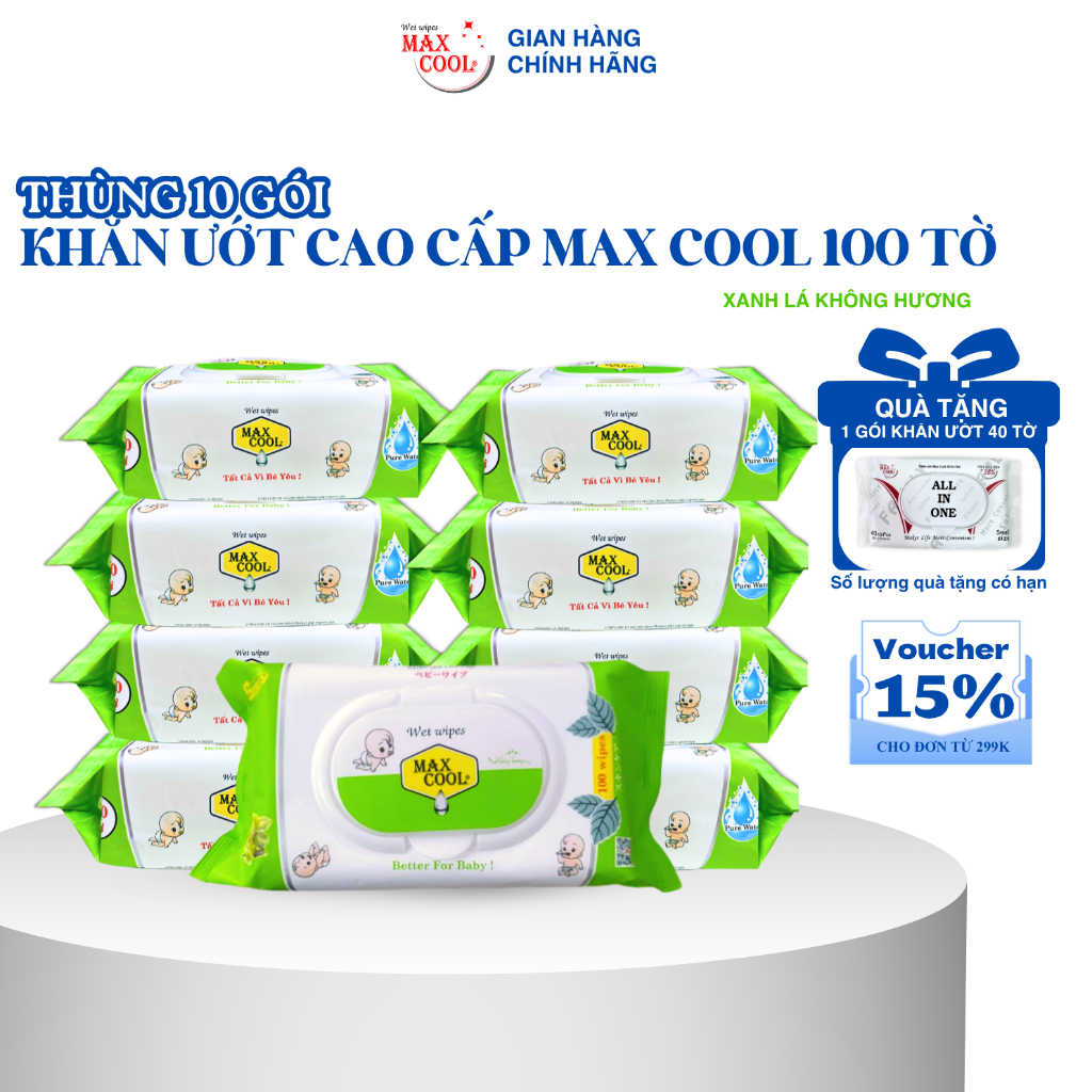 Thùng 10 gói khăn ướt cao cấp Max Cool 100 tờ, không hương- HÀNG CHÍNH HÃNG cao cấp an toàn cho bé