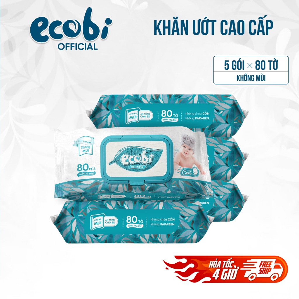 Thùng 05 gói khăn ướt cao cấp Ecobi gói 80 tờ không mùi