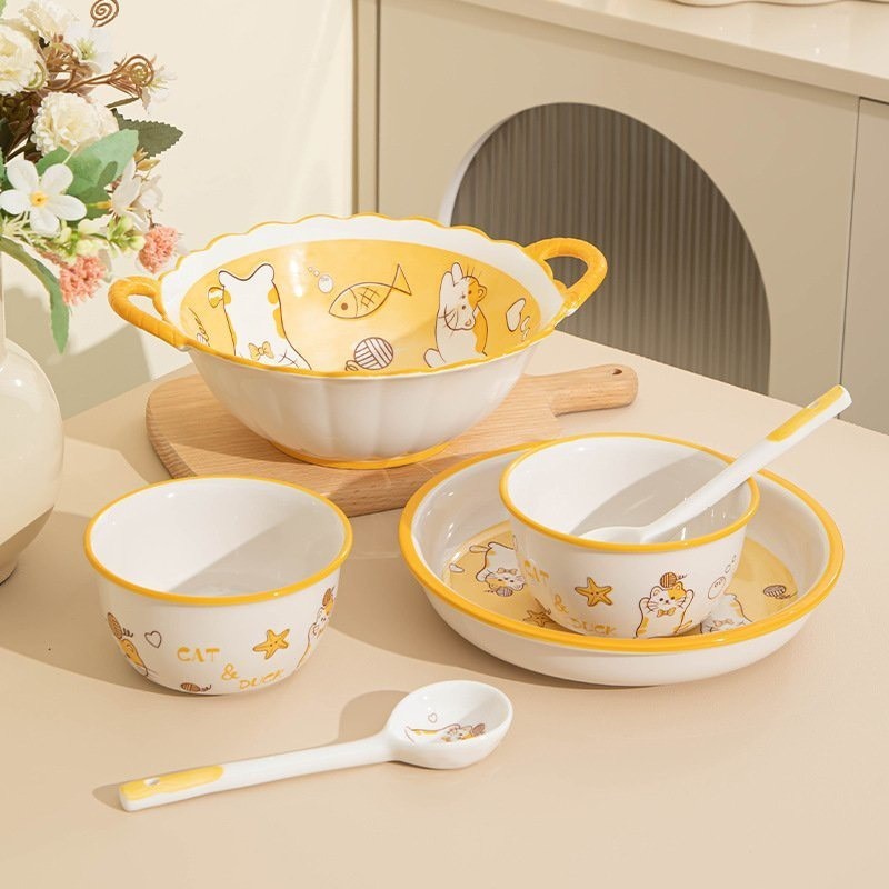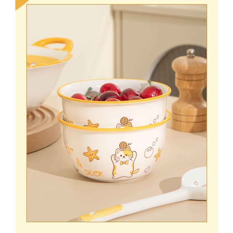 Kim Cương shop 2023set 4 Bát cơm kèm thìa , chén ăn cơm bằng sứ hoạ tiết mèo vàng. Mẫu mới dễ thương