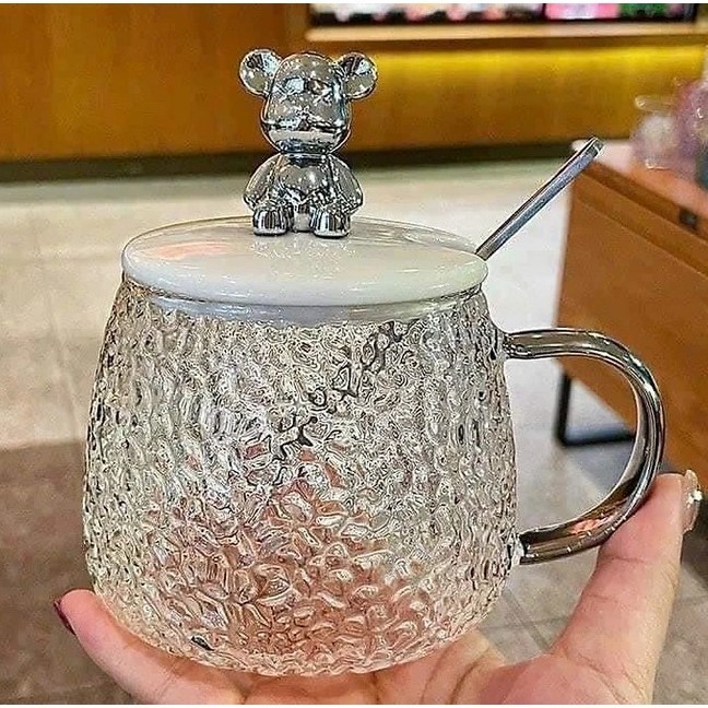 3345- Cốc hút ly thủy tinh tặng kèm nắp gấu,thìa 400ml