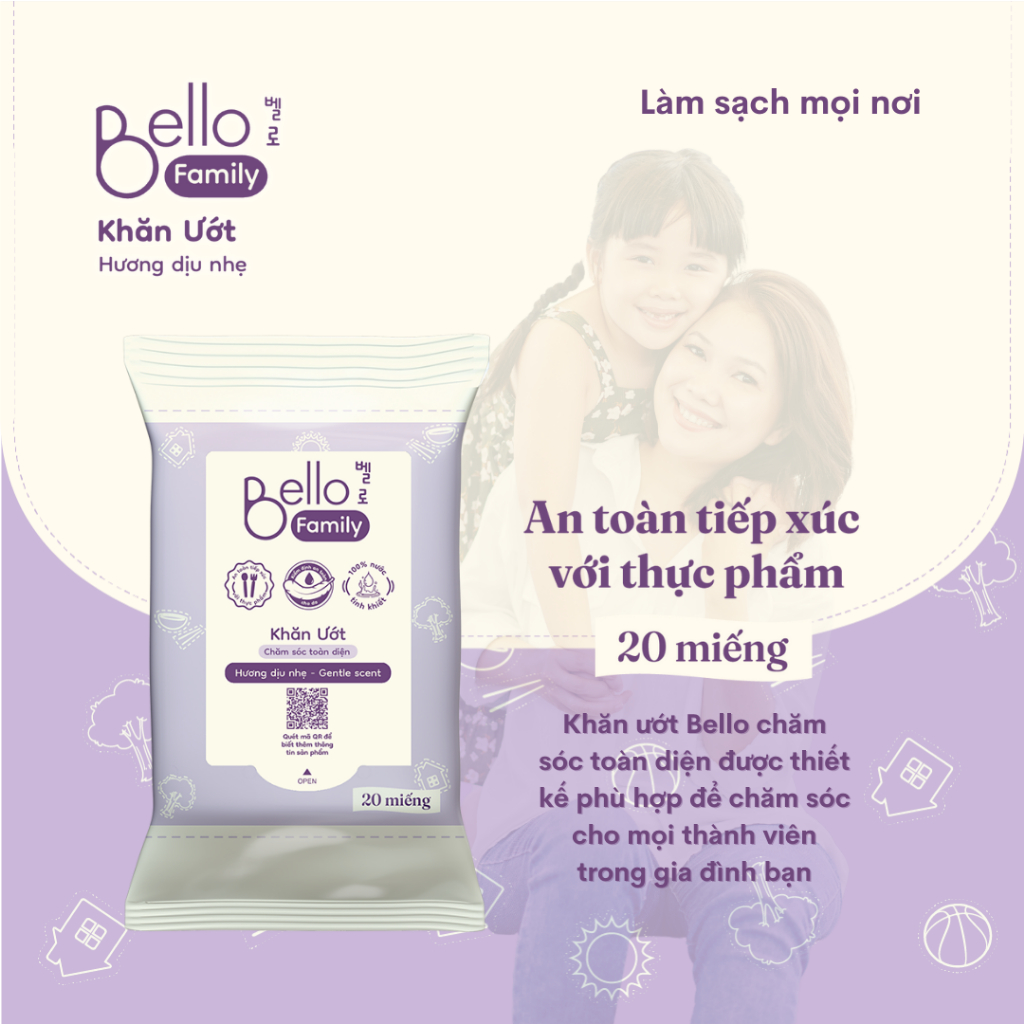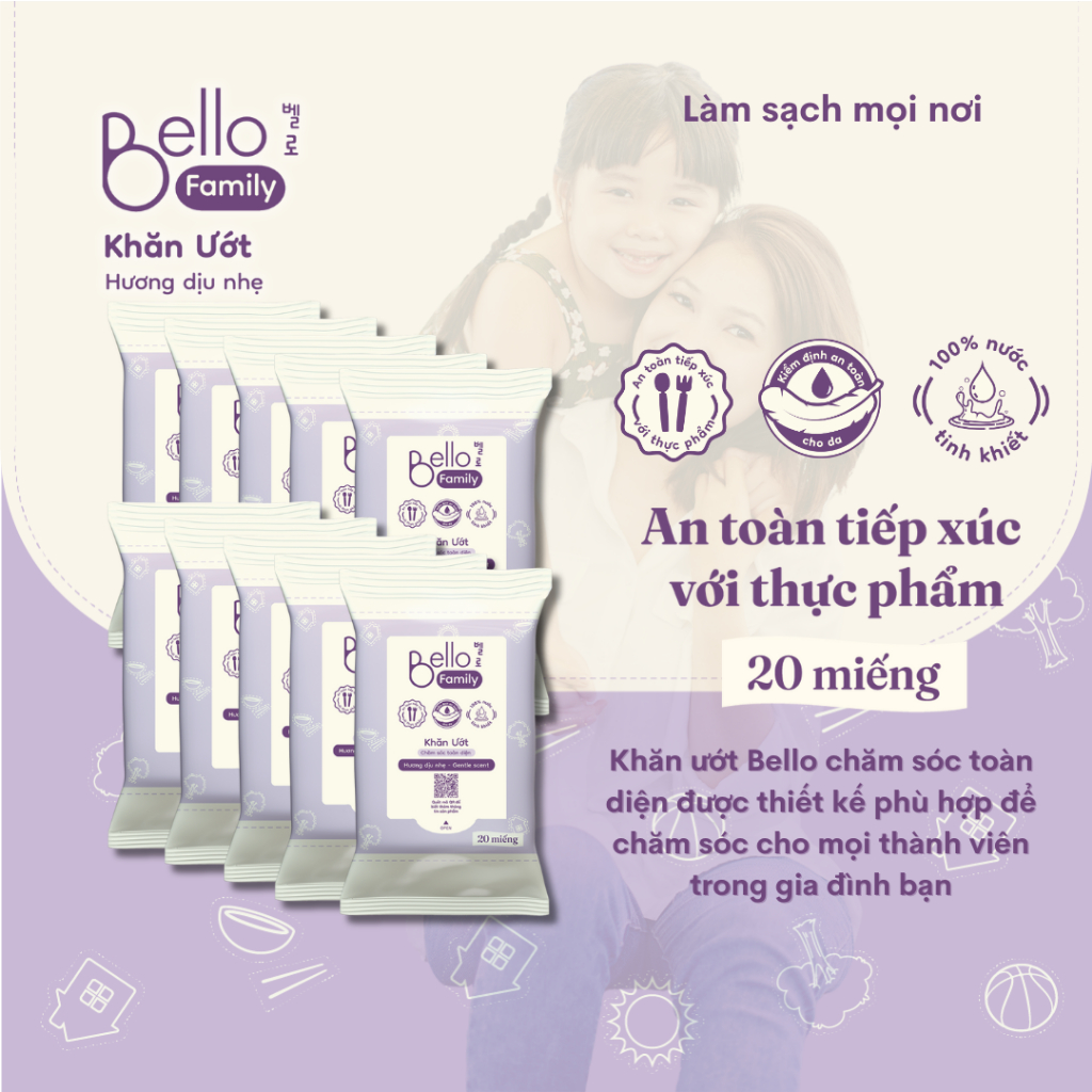 Combo 5, Combo 10 Gói Khăn Ướt 20 Tờ Bello Hương Thơm Dịu Nhẹ Không Cồn Không Paraben