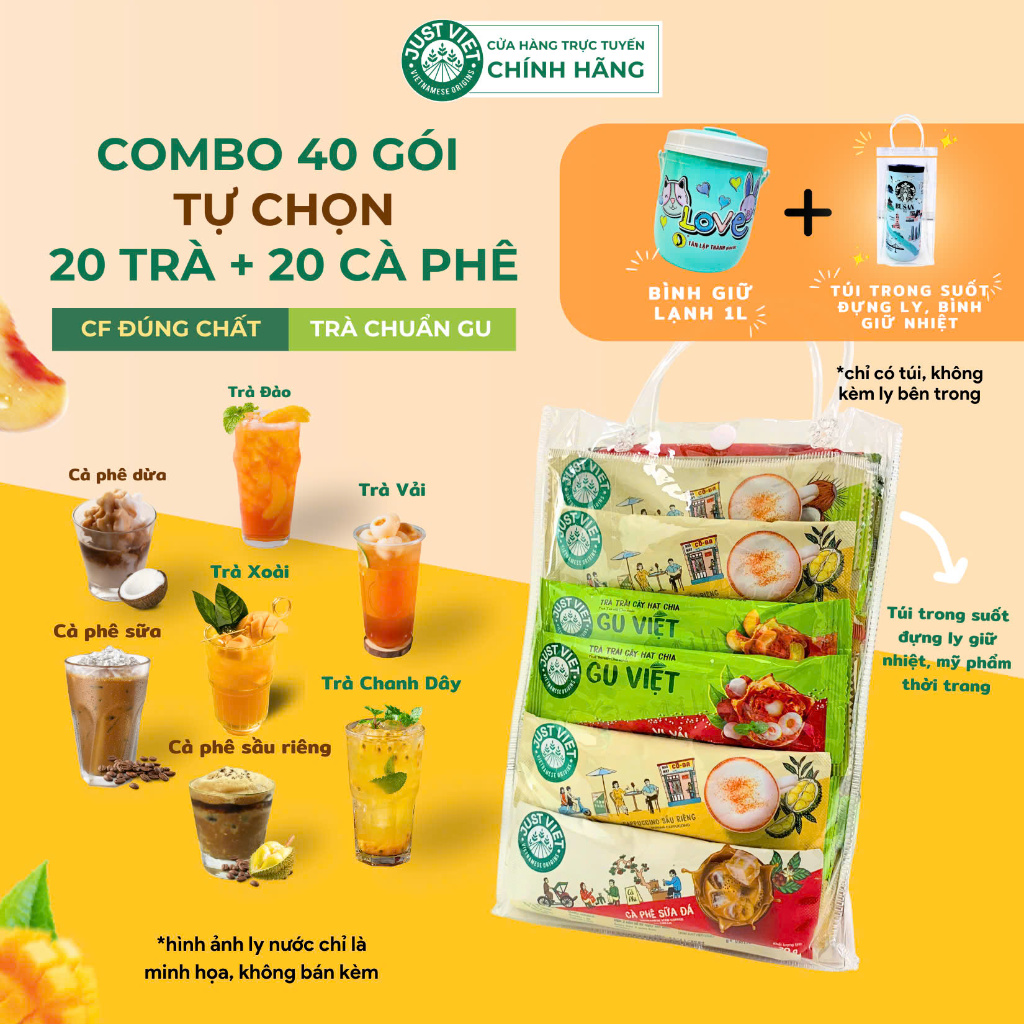 Combo 40 gói Trà Trái Cây và Cà Phê Mix Vị (Đào/Xoài/Vải/Chanh Dây/Sữa/Sầu Riêng/Dừa)