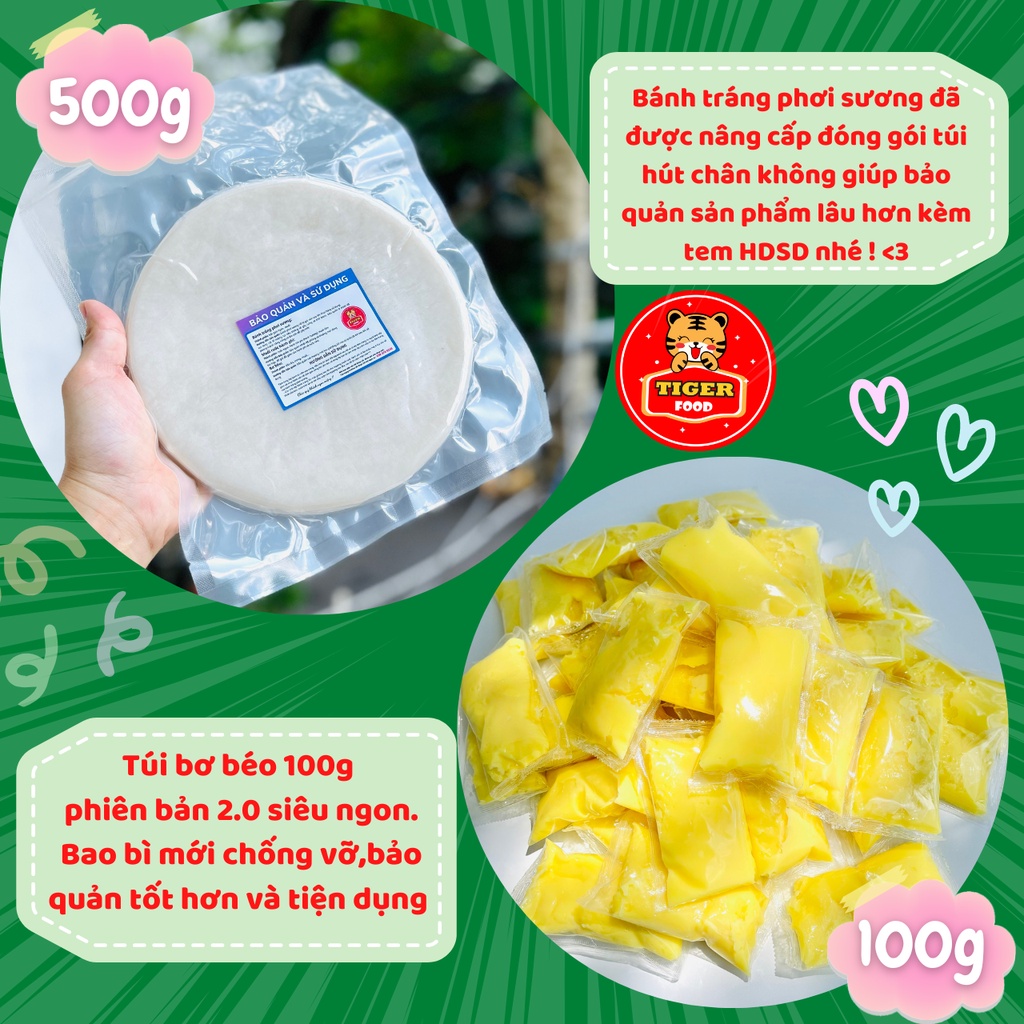 COMBO Bánh tráng phơi sương 1kg TIGER FOOD Bánh tráng + Bơ béo + Muối tôm hành phi - COMBO 1KG ăn đã cái Nư