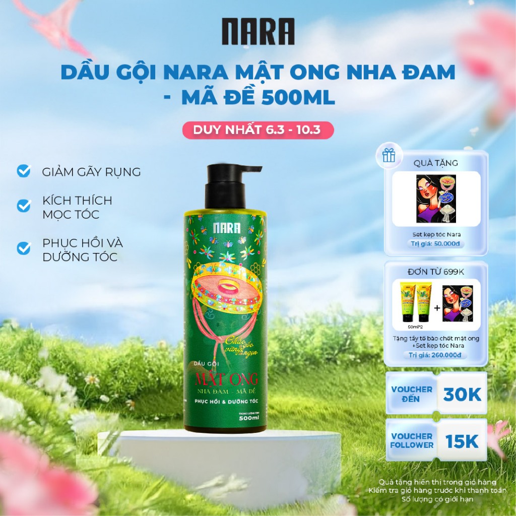 [Mua 1 tặng 1] Bộ Đôi Dầu Gội Xả Giảm Gàu - Ngừa Rụng - Dưỡng Tóc NARA Mật Ong Kết Hợp Nha Đam & Mã Đề 500ML