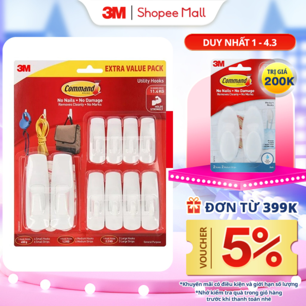 Combo 10 Móc dán tường 3M™ Command™, 17008EXVP, độ bền cao, bám cực chắc, chịu lực 2.2kg, Dùng sắp xếp nhà cửa