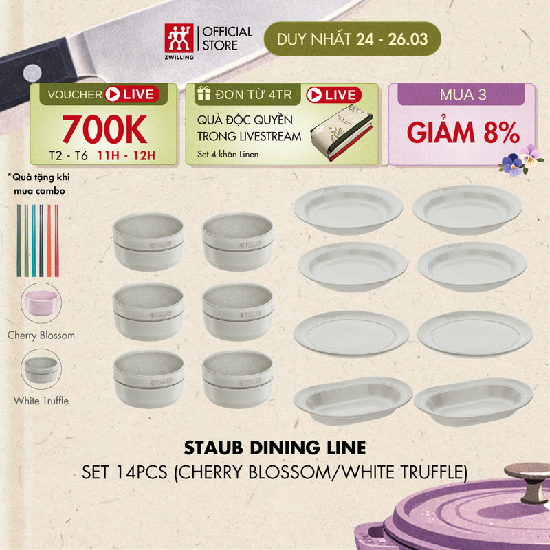 Bộ 14 món chén bát, đĩa gốm sứ STAUB Ceramic Dining Line (màu White Truffle/ Cherry Blossom)