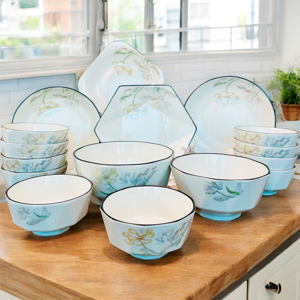 Bộ Chén Dĩa Gốm Sứ Gosu Trắng Cao Cấp Sáng Đẹp Họa Tiết Kim Cương Viền Đen