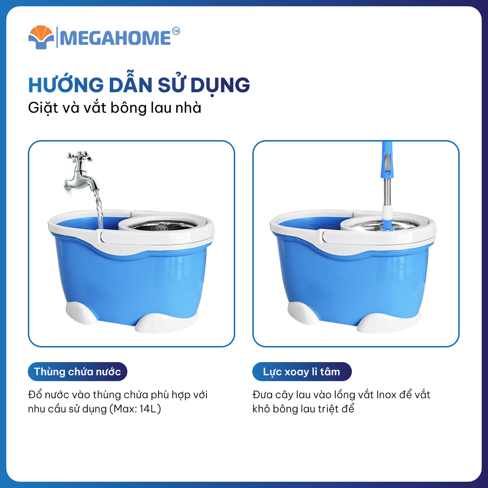 Bộ Lau Nhà Megahome X3 dung tích 17l, lồng vắt inox, mâm lau inox, xoay 360 độ