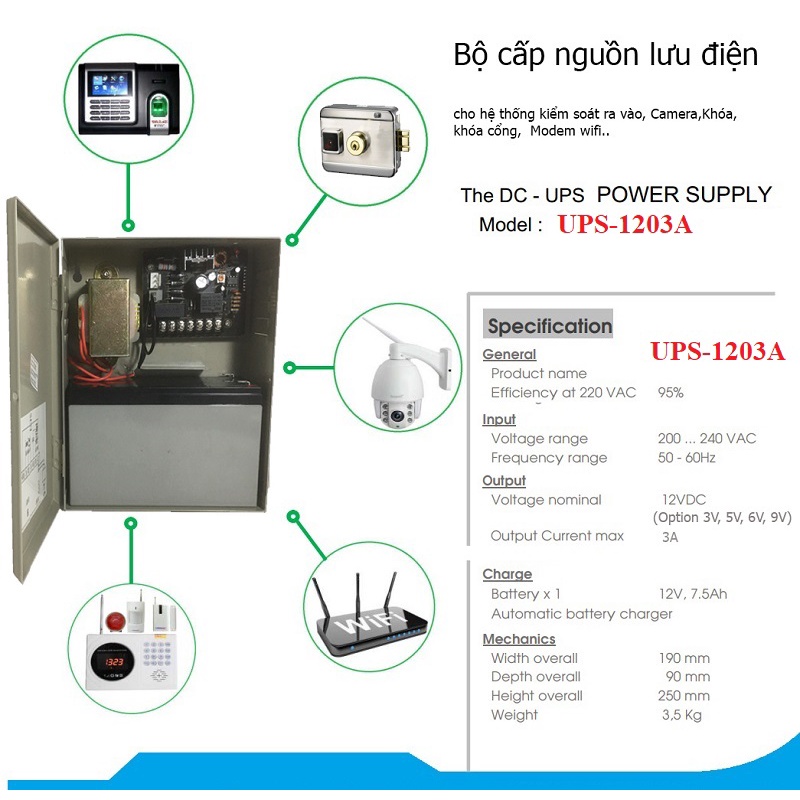 Bộ lưu điện 12V 3A UPS-1203A cho khóa, kiểm soát cửa, camera, modem, wifi