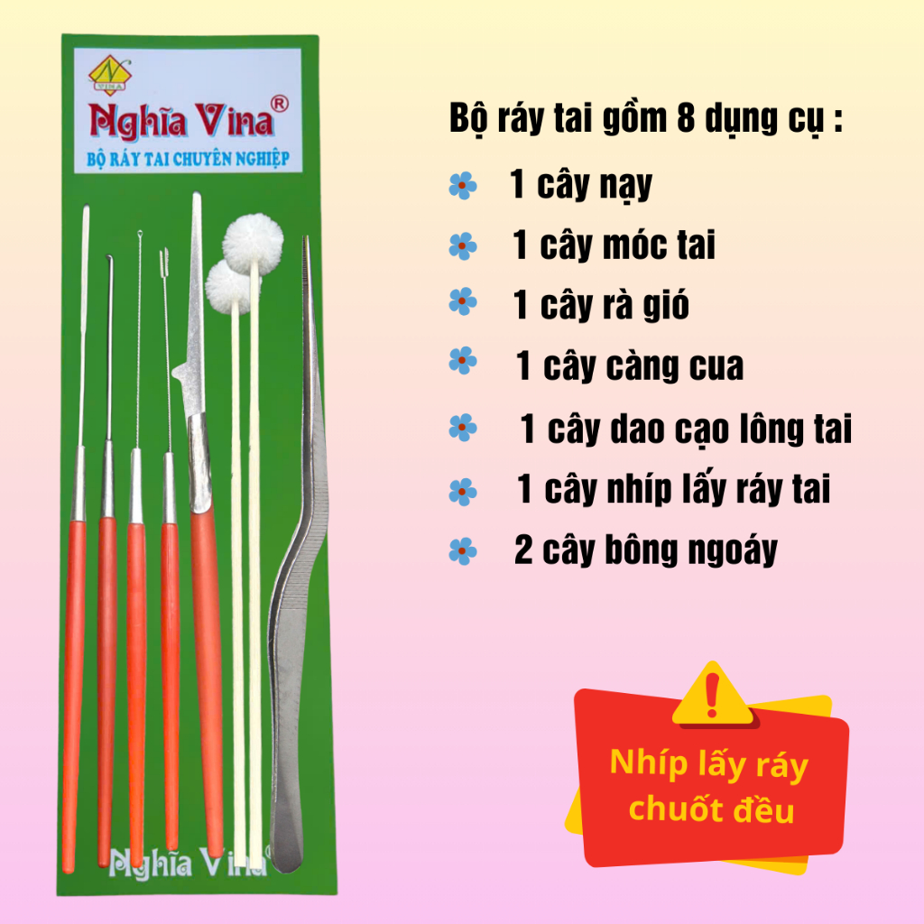Bộ ráy tai 8 dụng cụ cán nhựa đỏ Nghĩa Vina nhíp chuốt đều, bộ móc ráy tai chuyên nghiệp , vệ sinh tai.