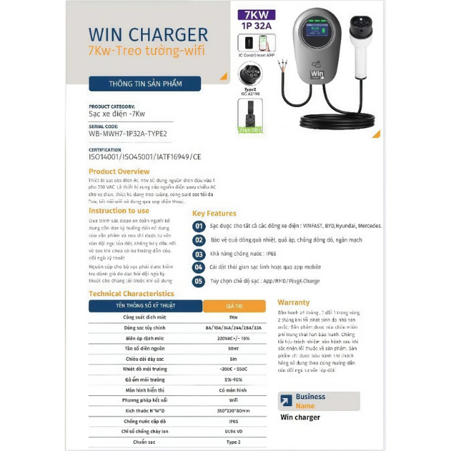 Bộ sạc xe ô tô điện 7kw Wincharge dùng điện 1Pha có kết nối wifi qua app, dùng cho hầu hết các dòng xe [Chính hãng]