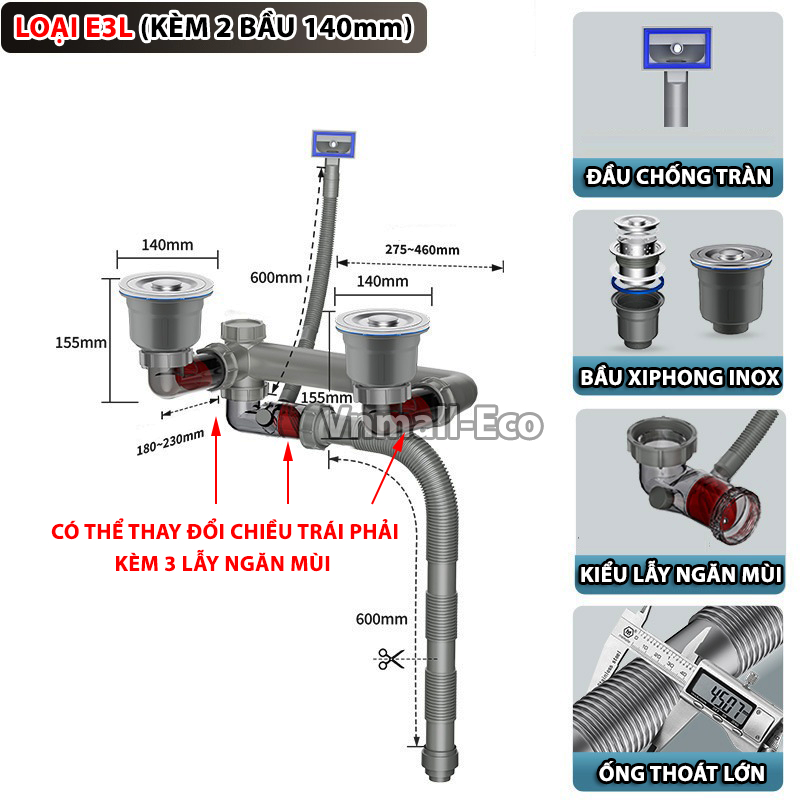 Bộ xiphong thoát nước ngăn mùi chống tắc nghẽn bồn rửa bát