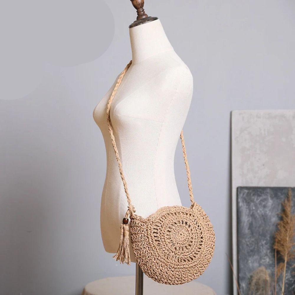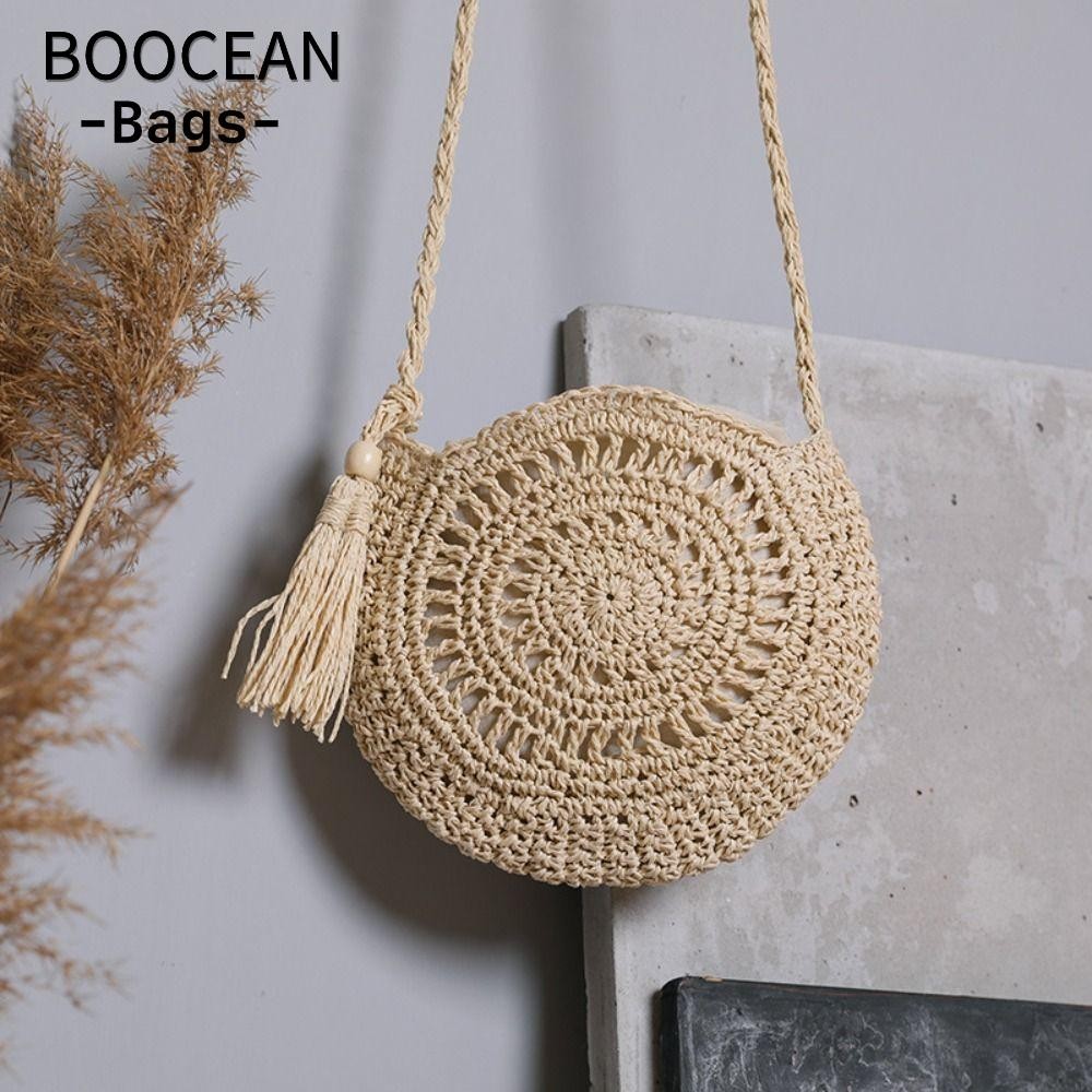 BOOCEAN Túi đeo vai dây giấy, Túi cói thủ công thời trang tròn, Túi rơm rỗng đi biển tua rua nữ