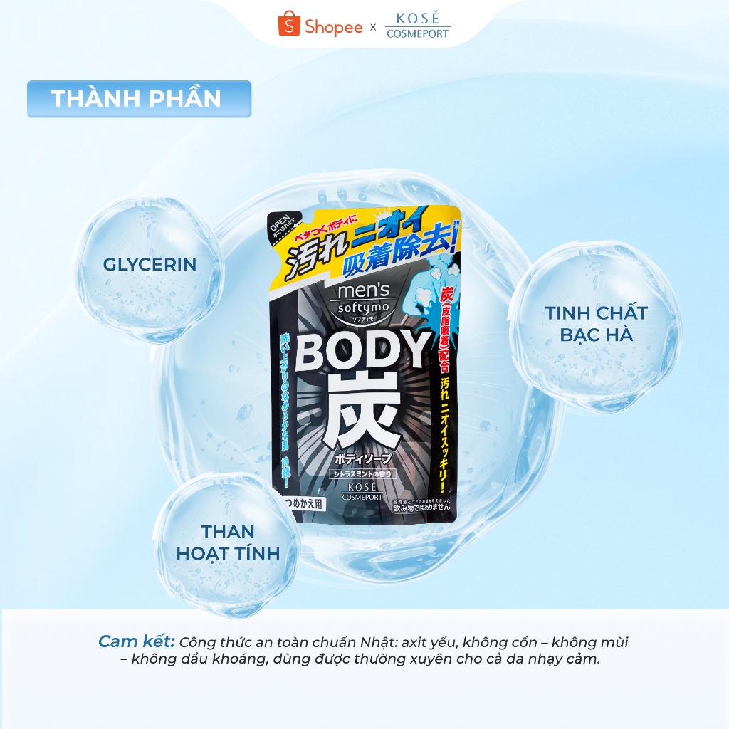 Sữa Tắm Than Hoạt Tính Dành Cho Nam Kose Men's Softymo Rinse In Scalp Shampoo (Charcoal) Túi Refill 400ml