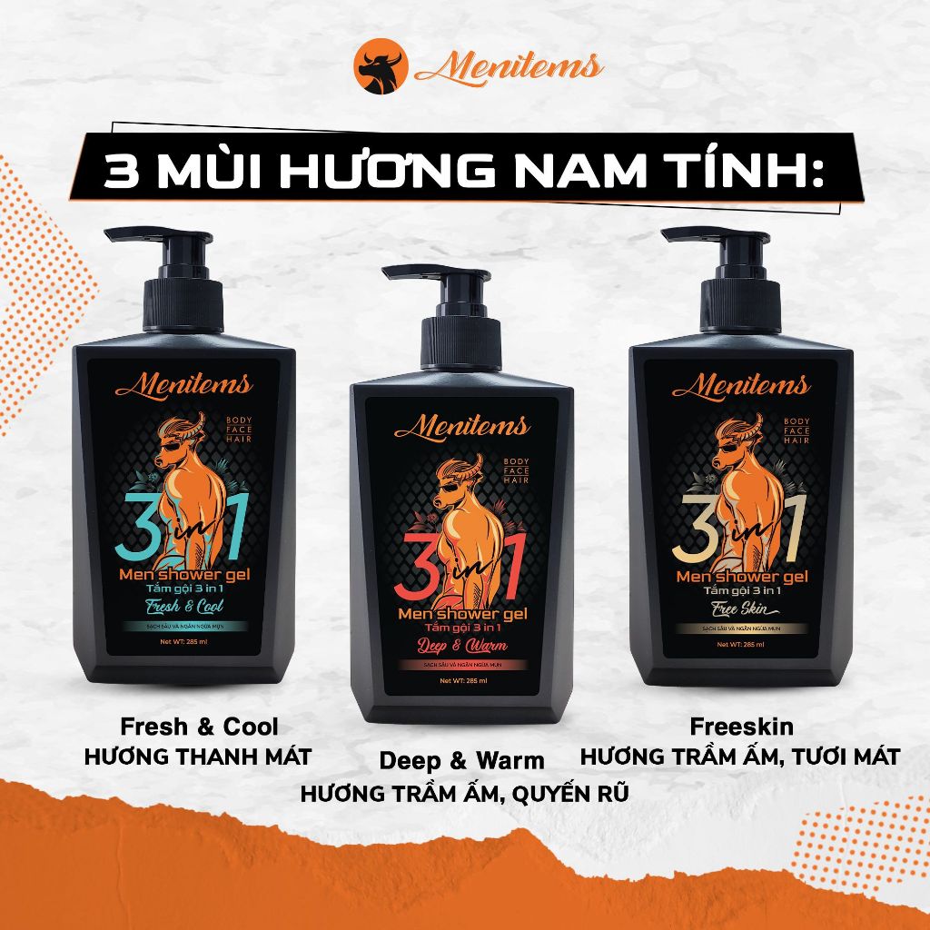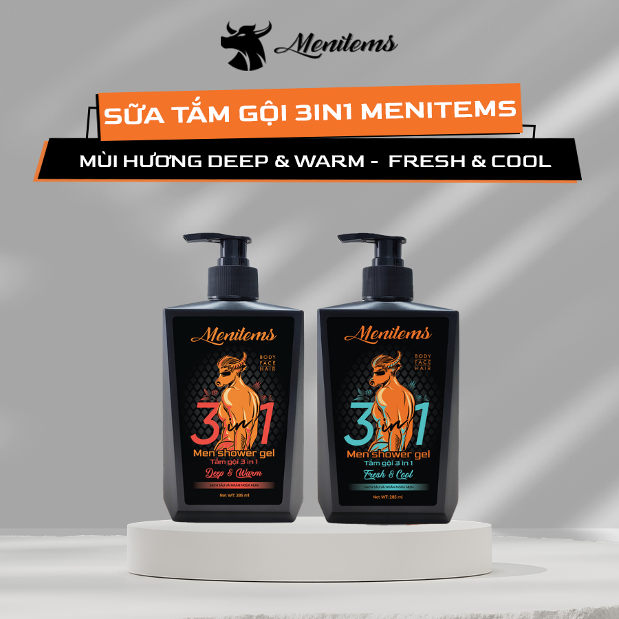 Sữa tắm gội 3in1 Menitems, hỗ trợ giảm mụn lưng, ngừa mụn, làm sạch sâu, lưu hương nước hoa 285 ml