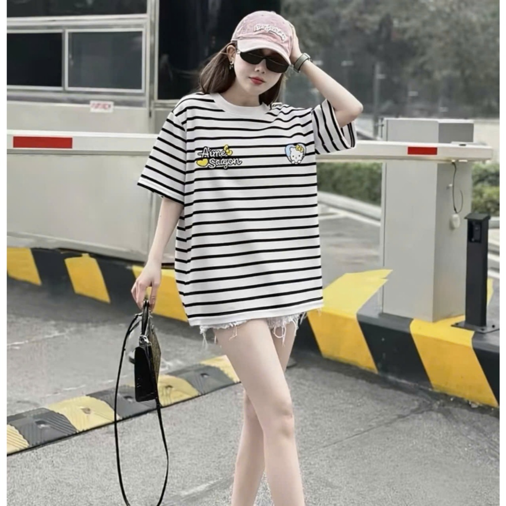 Áo thun kẻ IN MÈO TYM VÀNG TAY NGẮN basic nam nữ THUUNISEX M2025