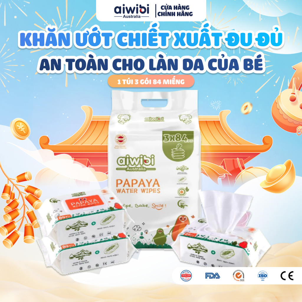 Khăn Giấy Ướt Aiwibi Chiết Xuất Đu Đủ Hữu Cơ Không Mùi và Không Cồn Cho Bé 1 lốc x 3 gói x 84 tờ