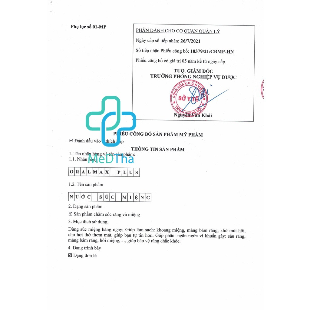 Nước Súc Miệng Oralmax Plus - Ngăn Ngừa Hôi Miệng, Làm Sạch Khoang Miệng, Ngăn Ngừa Vi Khuẩn - 250ml