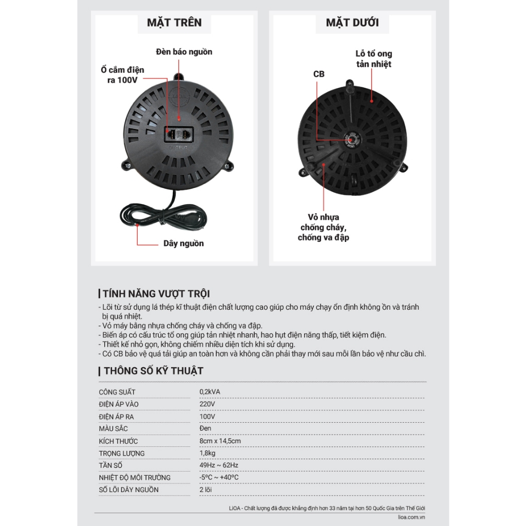 Biến Áp Đổi Nguồn Hạ Áp 1 Pha LiOA mã DN002A. 200VA. Điện Áp Vào 220V, Điện Áp Ra 100V. Bảo Hành 3 Năm
