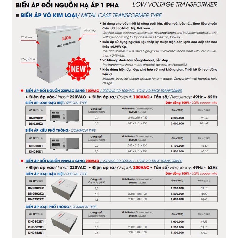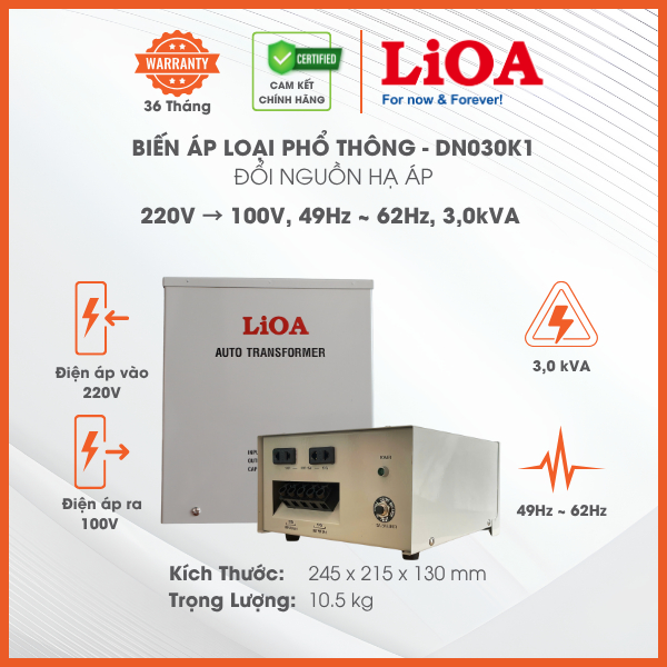 Biến Áp Đổi Nguồn Hạ Áp 1 Pha LiOA mã DN030K1 Loại Phổ Thông. Công Suất 3,0kVA 3000VA. Điện Áp Vào 220V, Điện Áp Ra 100V