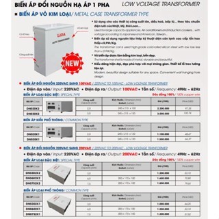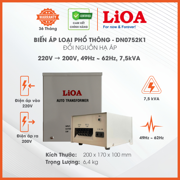 Biến Áp Đổi Nguồn Hạ Áp 1 Pha LiOA mã DN0752K1 Loại Phổ Thông. Công Suất 7500VA. Điện Áp Vào 220V, Điện Áp Ra 200V