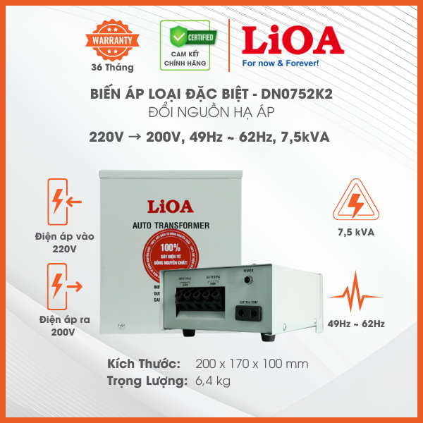 Biến Áp Đổi Nguồn Hạ Áp 1 Pha LiOA mã DN0752K2, Loại Đặc Biệt Dây Đồng 100%. Công Suất 7500VA. Điện Áp Vào 220V, Ra 200V
