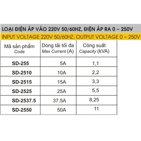Biến Áp Vô Cấp LiOA mã SD-255 5A 1,1kVA 1100VA. Điện Áp Vào 220V, Điên Áp Ra 2V-250V. Dây Đồng 100%. Bảo Hành 36 Tháng.