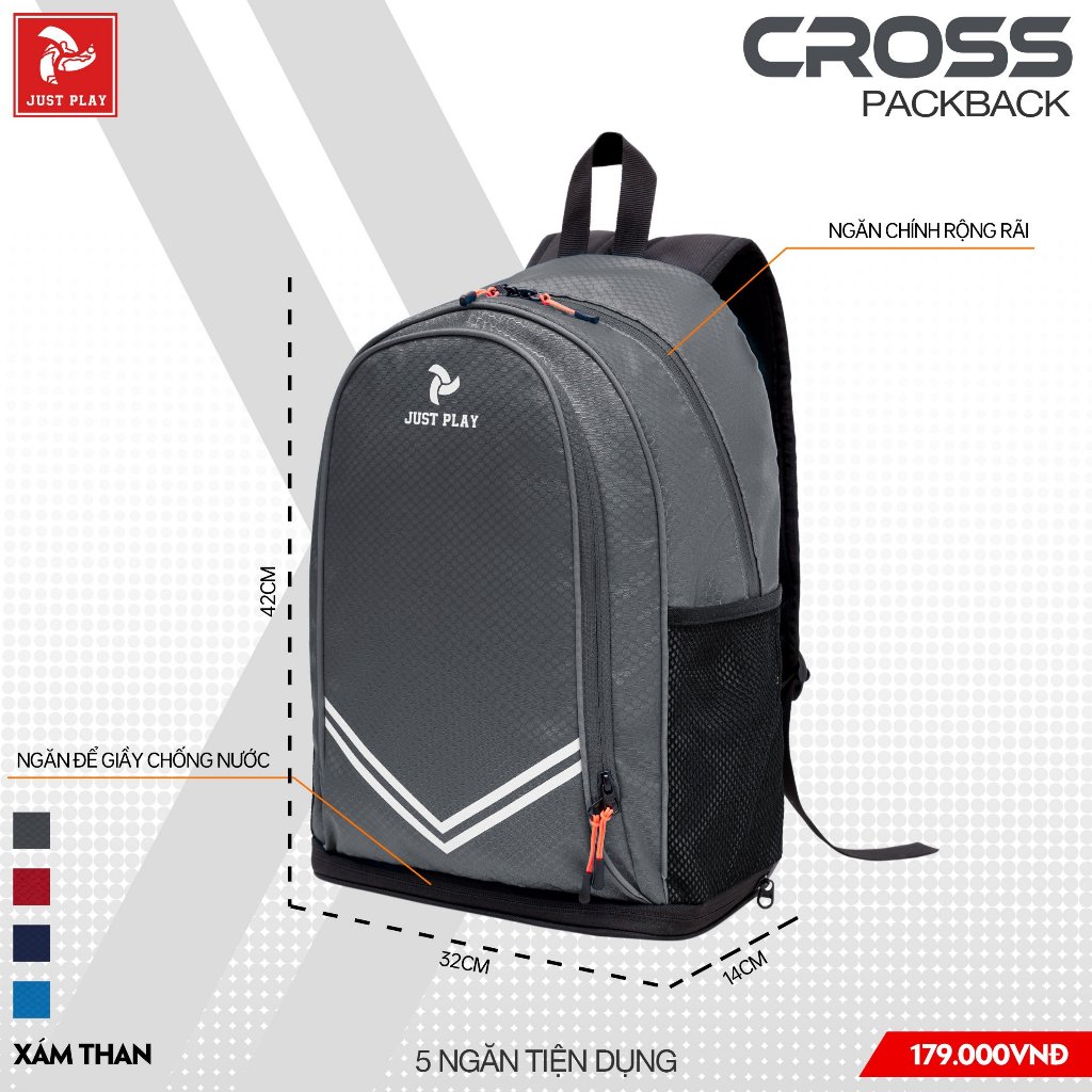 Balo thể thao Just Play Cross nhỏ gọn nhiều ngăn tiện lợi, có ngăn đựng giày đồ dơ riêng, chống nước