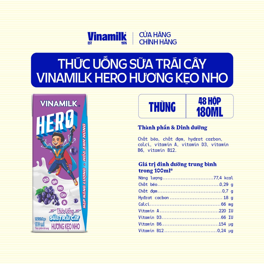 Thùng Thức uống Sữa trái cây kẹo nho Vinamilk Hero 180ml - 48 hộp/Thùng