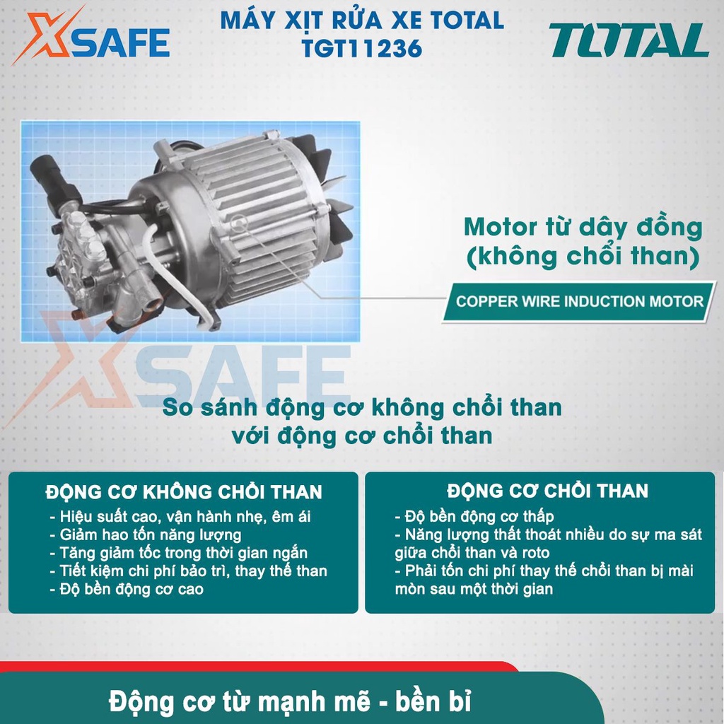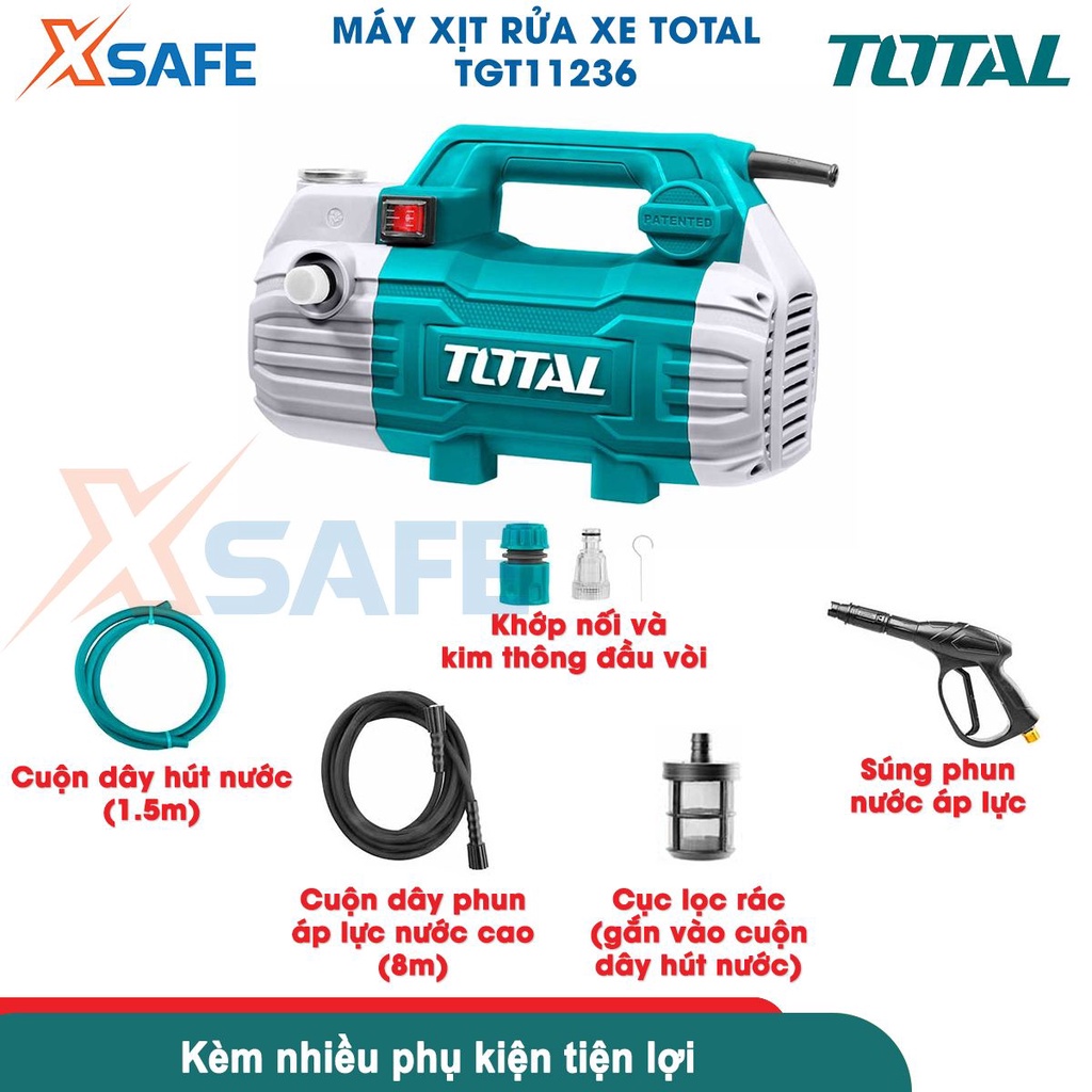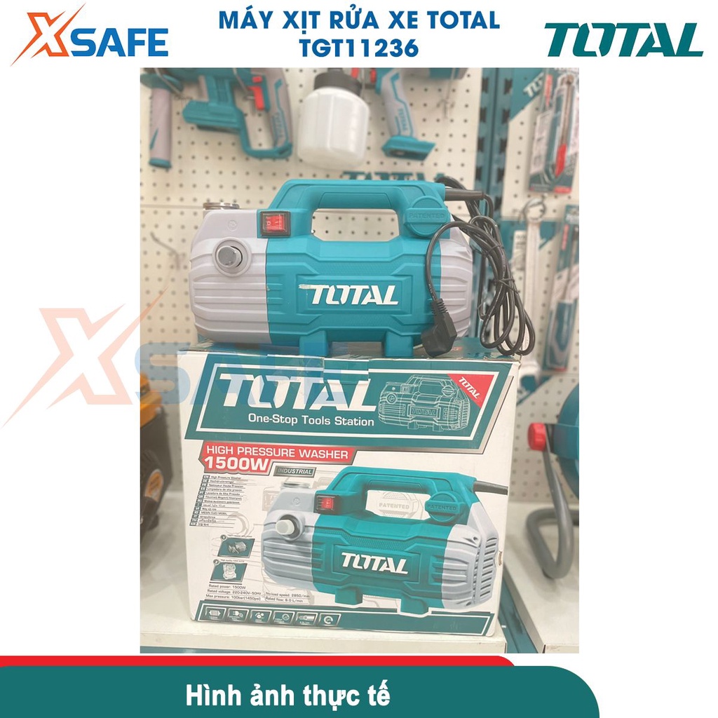 Máy xịt rửa xe TOTAL TGT11236 1500W dây đồng, motor từ không chổi than Máy rửa xe cao áp 100Bar kèm dây xịt 8m, phụ kiện
