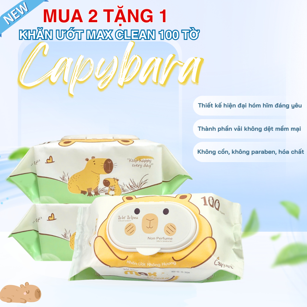 Mua 2 tặng 1 khăn ướt cao cấp 100 tờ Max Clean hình Capybaraa siêu đáng yêu - Không hương