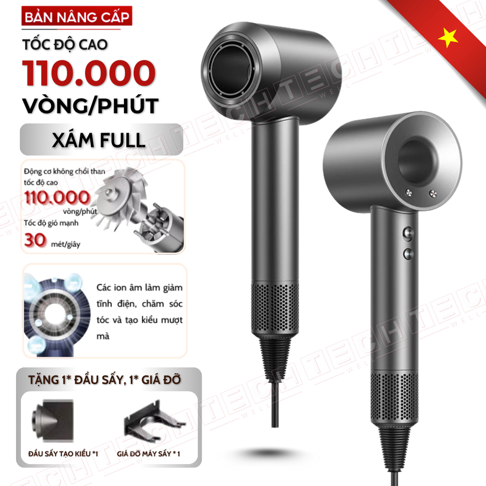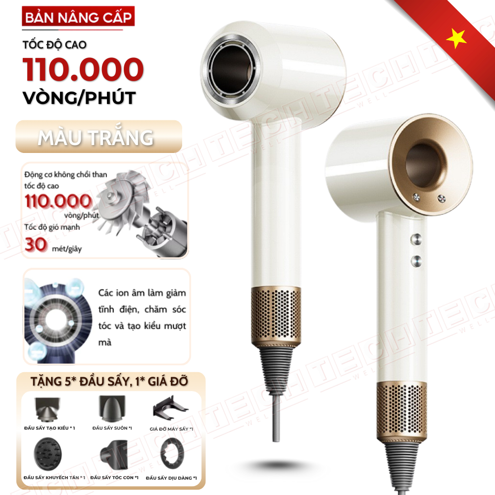 Máy Sấy Tóc ION Âm Không Cánh 2 Chiều Nóng Lạnh, 3 Mức Gió Công Suất Cao Tặng Kèm Đầu Sấy Tạo Kiểu