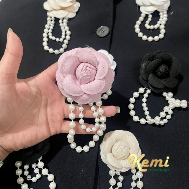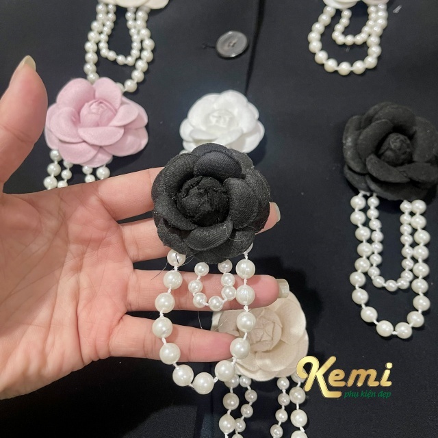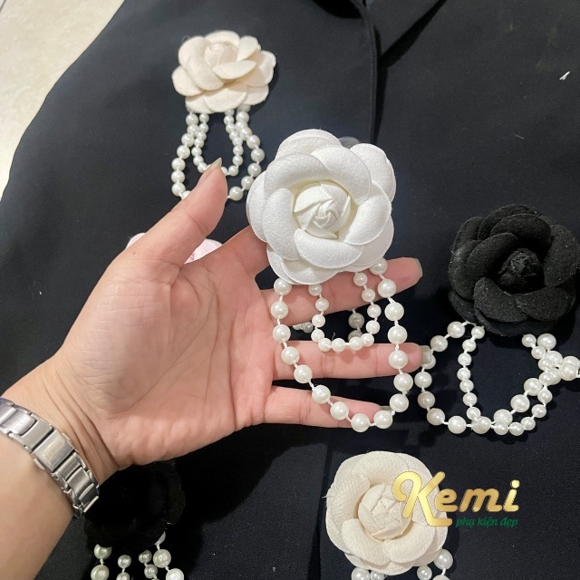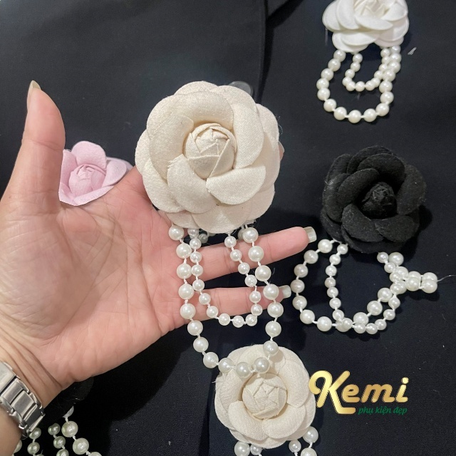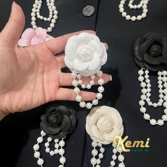 Hoa trà dạ cánh trắng - đen bông 5 cm trang trí phụ kiện n thời trang handmade kèm đế cài