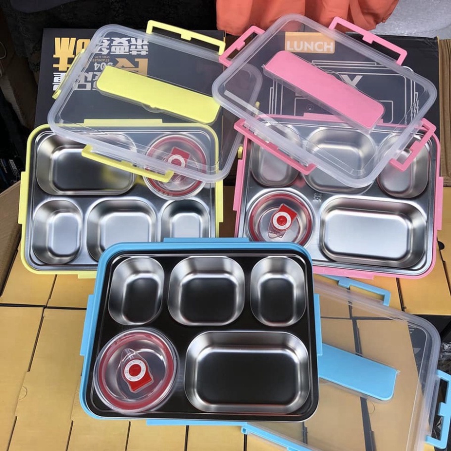[SaLe 88%] Hộp Cơm INox [304] 5 Ngăn+Bát Canh+Thìa Đũa+Kèm Nắp Đậy Chống Tràn .[SBX]
