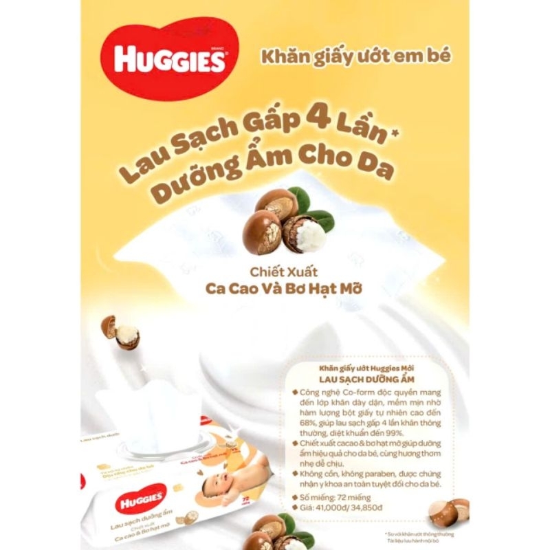 Thùng 12 gói khăn ướt Huggies Bơ-Cacao hạt mỡ loai 72 miếng/1goi