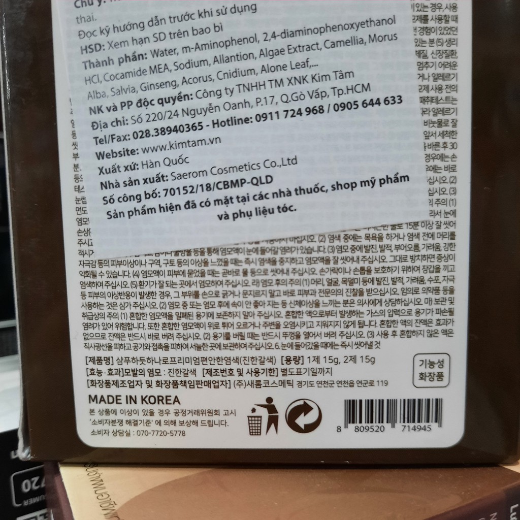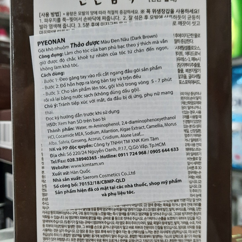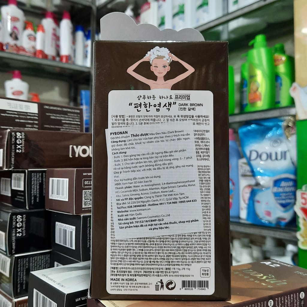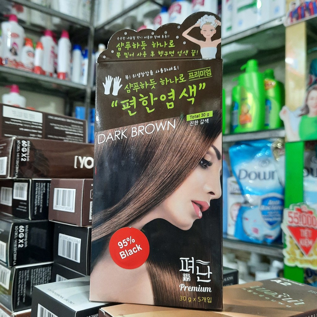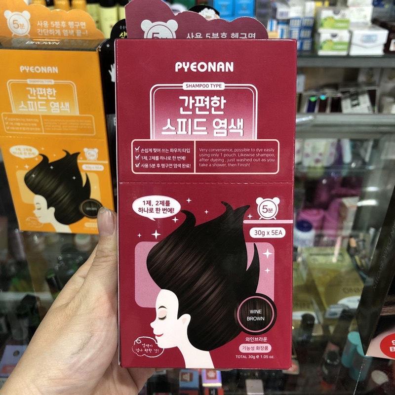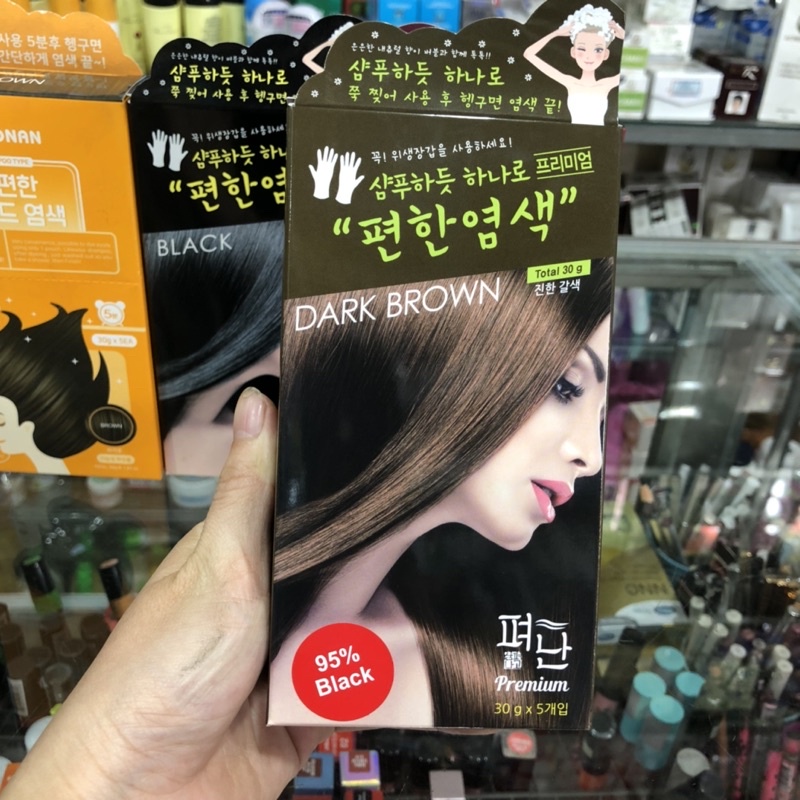 1 hộp gồm 5 gói gội khô nhuộm Pyeonan Hàn quốc màu đen nâu (dark Brown)