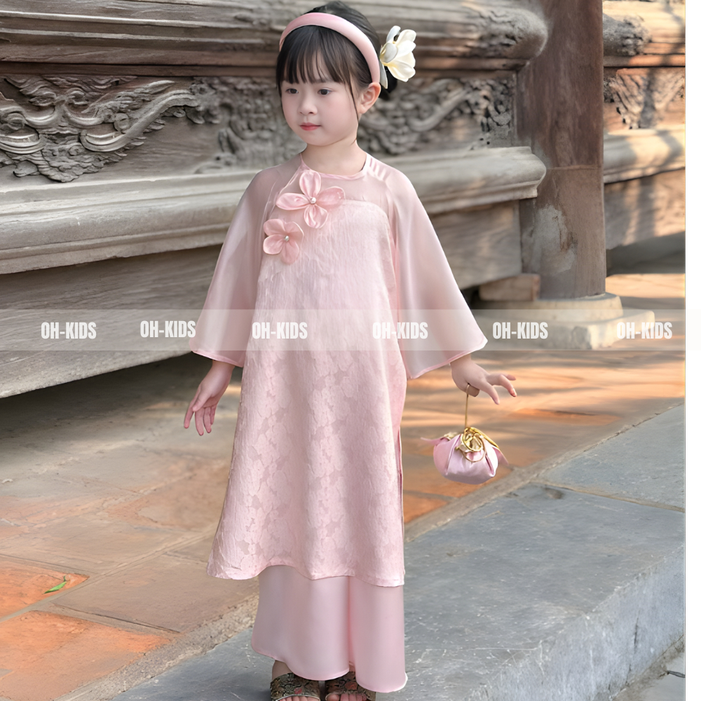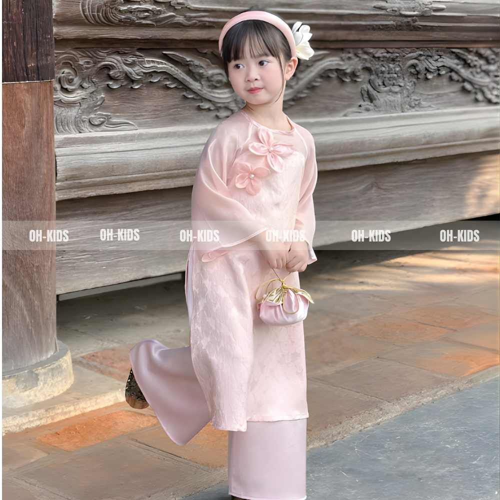 Áo Dài Bé Gái Hồng Phấn Hoa 3D – Vải Mềm Mại, Dáng Suông,Set Áo Dài Truyền Thống - OH KIDS OH42