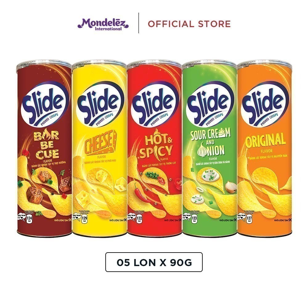 Bánh Lát Snack Khoai Tây Slide Vị Ngẫu Nhiên (Tự Nhiên, Thịt Nướng, Phô Mai, Kem Chua & Hành, Thơm Cay), Combo 5 Lonx90g