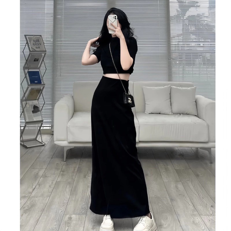 Chân Váy Midi Đen Dáng Dài Cạp Cao Co Giãn 4 Chiều, Chân Váy Thun Nữ Dài 85cm Siêu Tôn Dáng