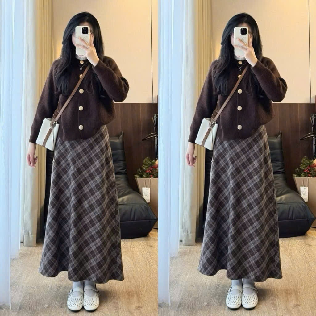 Chân váy dạ Hari Kẻ Dáng Dài Form A xoè nhẹ style Vintage có lót trong dạ caro dáng midi 3574 P2