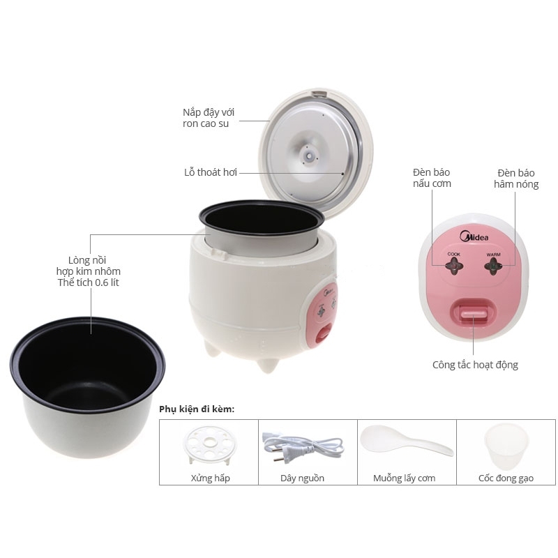 Nồi Cơm Điện Mini Midea CM06SA, Dung Tích 0.6Lit - Công Suất 400w, Hàng Chính Hãng