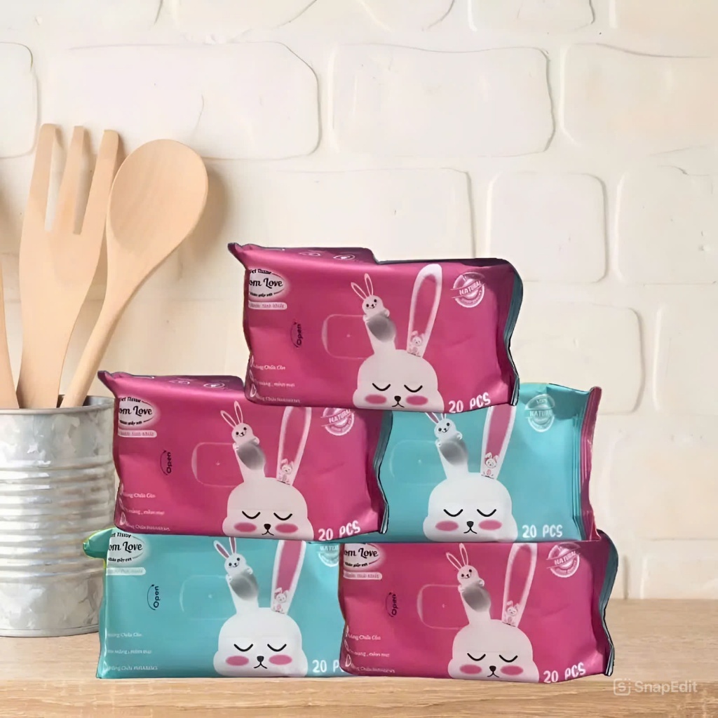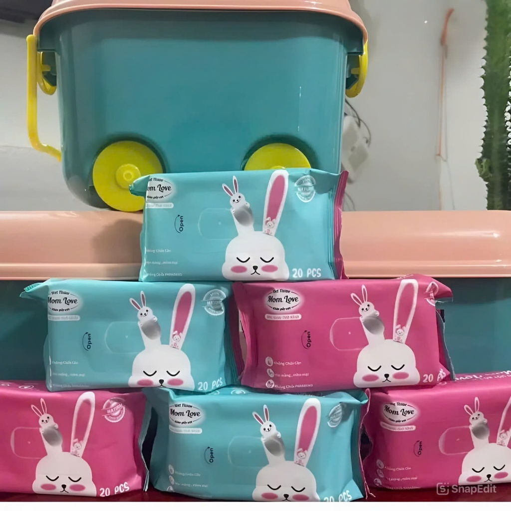 Sét 10 Gói Khăn Ướt Thỏ Mon Love Tặng Kèm Thùng Nhựa Kéo Có Bánh Xe Siêu Đáng Yêu