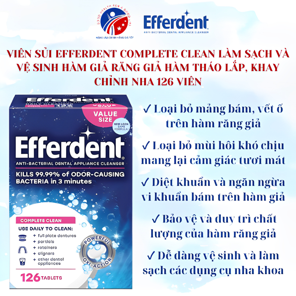 Viên Sủi Efferdent Complete Clean Làm Sạch Và Vệ Sinh Hàm Giả Răng Giả Hàm Tháo Lắp Vỉ 6 Viên (Mỹ)