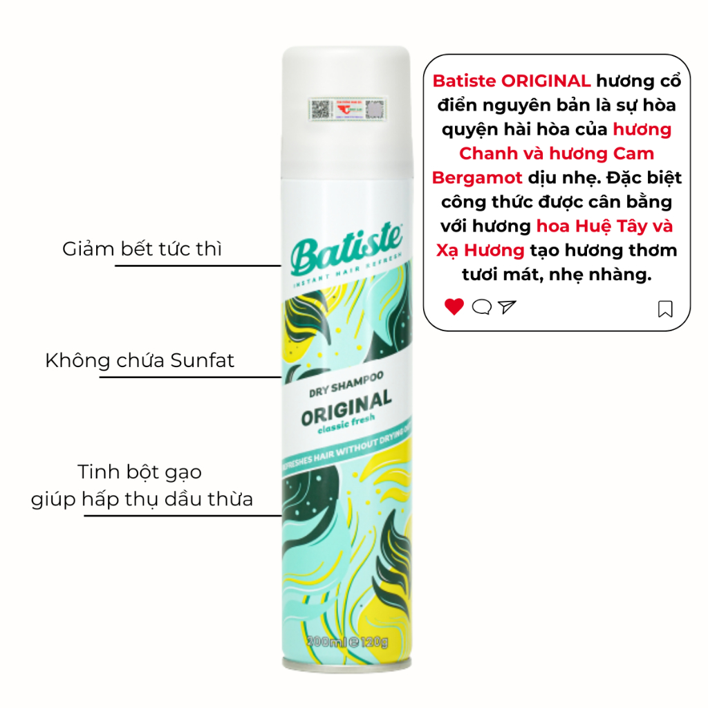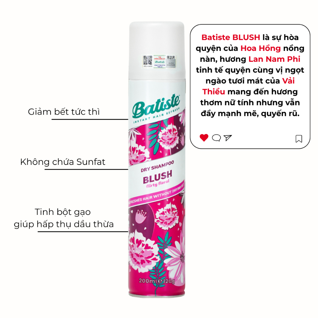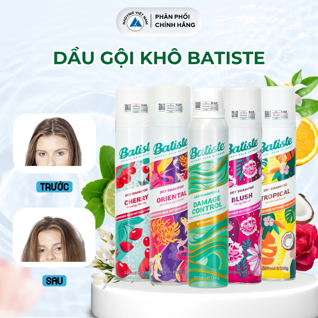 Dầu Gội Khô Batiste Cho Mái Tóc Bồng Bềnh, Hết Ngứa, Hết Bết Dính 200ml