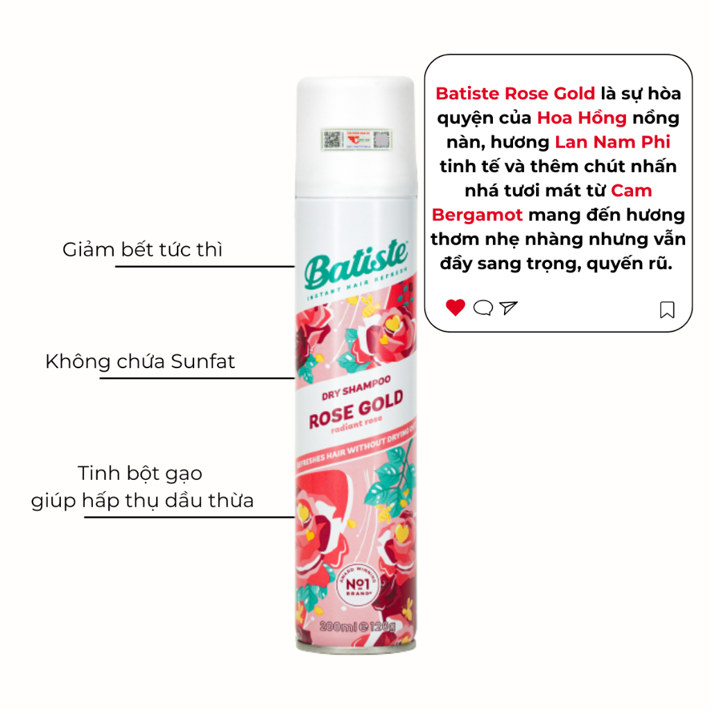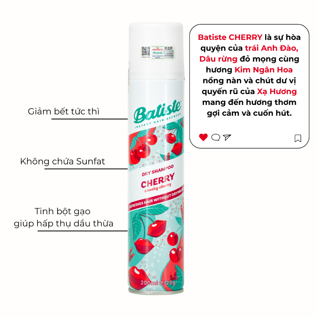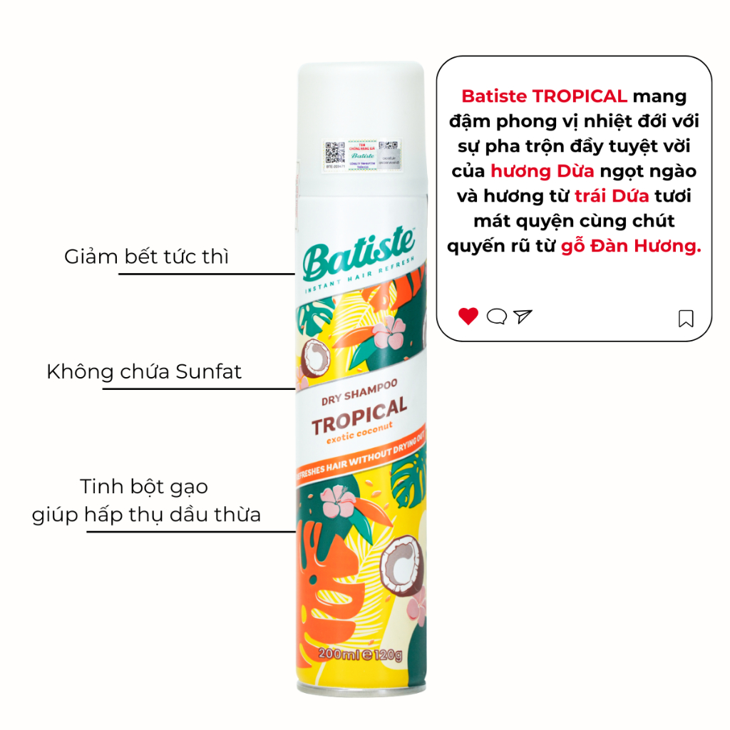 Dầu Gội Khô Batiste Cho Mái Tóc Bồng Bềnh, Hết Ngứa, Hết Bết Dính 200ml