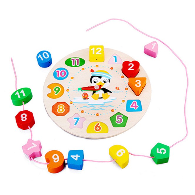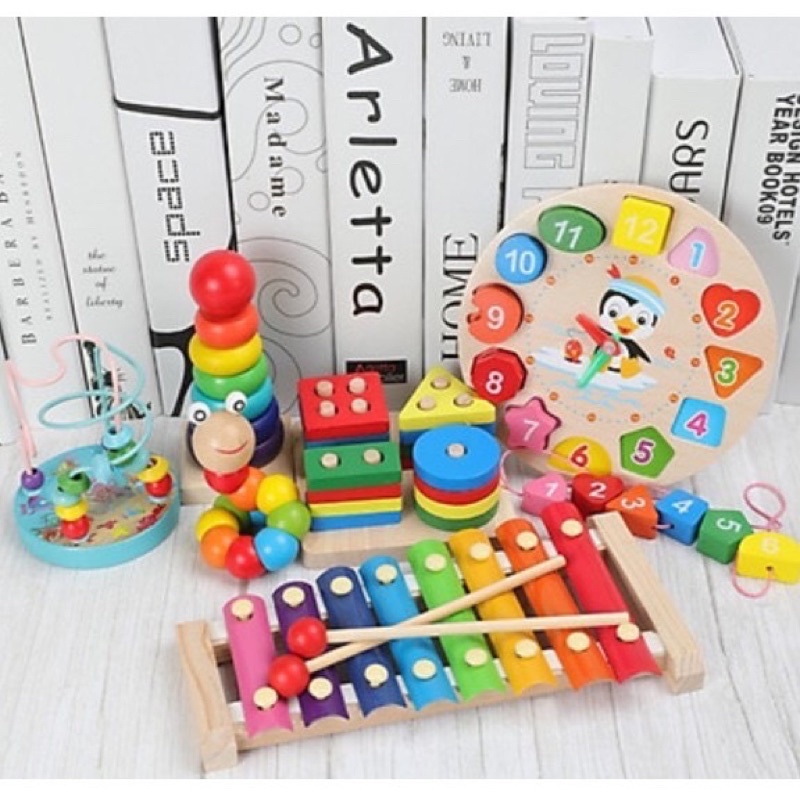 Combo sét 6 món đồ chơi gỗ luồn hạt - sâu gỗ - đàn gỗ - cầu vồng - thả hình 4 trụ - đồng hồ xâu hạt